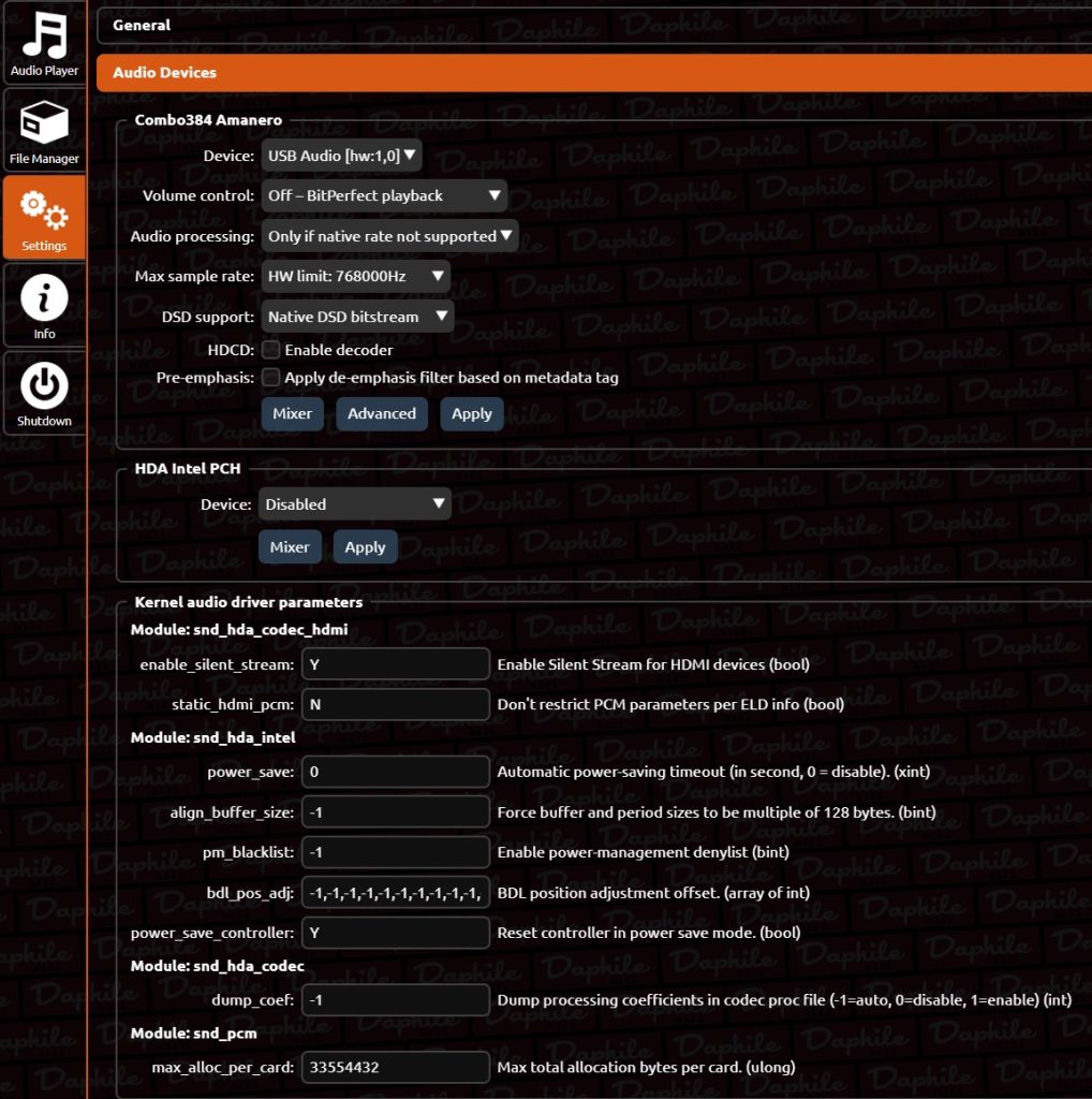 Der Anschluss erfolgt von einem beliebigen USB-Port des Hosts, – in meinem Fall der erwähnte Mac mini, an die Amanero-Platine. Die Konfiguration in Daphile hatte mir Anfangs etwas Probleme bereitet. Damit Dir das nicht auch passiert, zeige ich hier den betreffenden Screenshot aus der Konfigurationsseite. Der Abschnitt „Combo384 Amanero“ erscheint erst, wenn die Komponenten verbunden und aktiv sind: