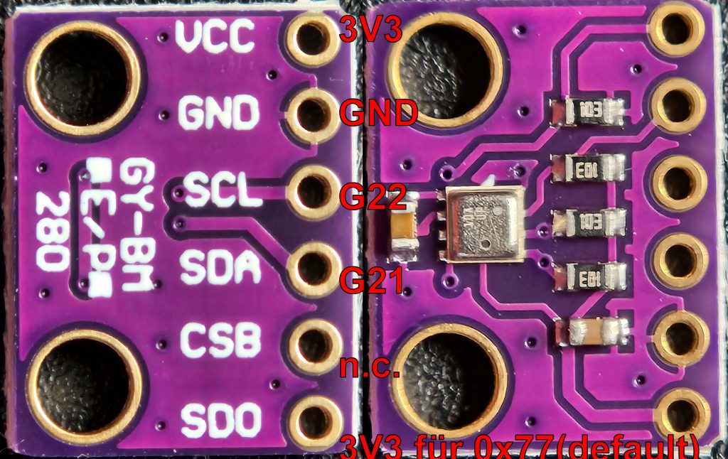 Nach erfolgreichem Neustart war ich zunächst erstaunt, dass keine Kommunikation mit dem BME280 stattfand. Der Fehler war schnell gefunden: Die ESPHome-Konfiguration setzt als Default I2C-Adresse 0x77. Dafür muss der SDO-Aschluss auf 3V3 gelegt werden.