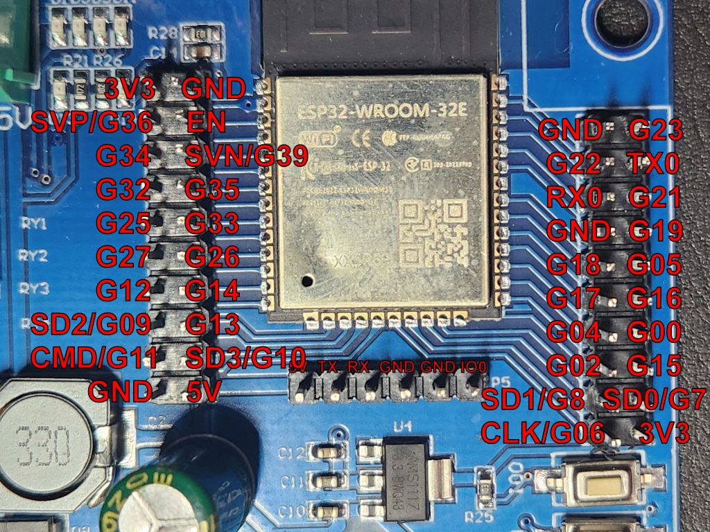 Auf der ESP-4fach-Relais-Platine sind die Anschlüsse für alle GPIO-Ports per Stiftleiste erreichbar. Für weitere Experimente wäre es aber gut, eine Beschriftung von der Bestückungsseite zu haben. Leider ist die Beschriftung nämlich nur auf der Lötseite vorhanden. Ich habe zudem noch einige fehlende Bezeichnungen hinzugefügt: